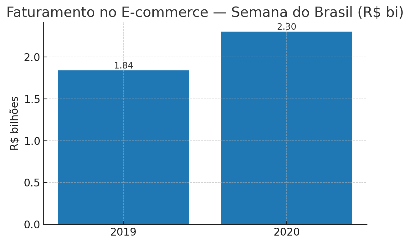 No digital, a data ganhou tração desde a estreia. Em 2019, a combinação de Semana do Brasil + Semana do Cliente (15/09) gerou +41% em faturamento e pedidos vs. o mesmo período de 2018, segundo Ebit|Nielsen. Em 2020, o e-commerce faturou R$ 2,3 bilhões na Semana do Brasil, +25% sobre 2019.