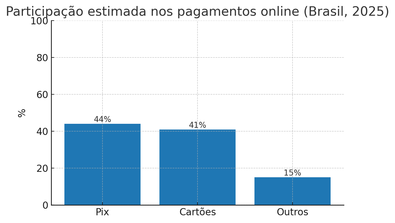Pix domina pagamentos online: estudos apontam que o Pix deve ultrapassar cartões no e-commerce já em 2025 (Pix 44% vs. cartões 41% de share), acelerado por recursos como o Pix Automático (pagamentos recorrentes) lançado em 16 de junho de 2025 e estimado para mover US$ 30 bilhões em e-commerce em dois anos. Ajuste preços/UX para o Pix (cashback, desconto no Pix e split) — é comportamento, não modinha.