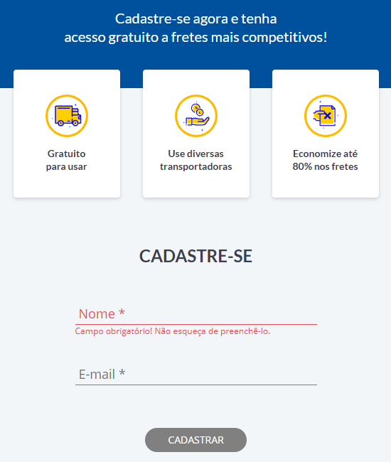 Em seguida, preencha os campos com seu nome e e-mail, clique em “CADASTRAR”.