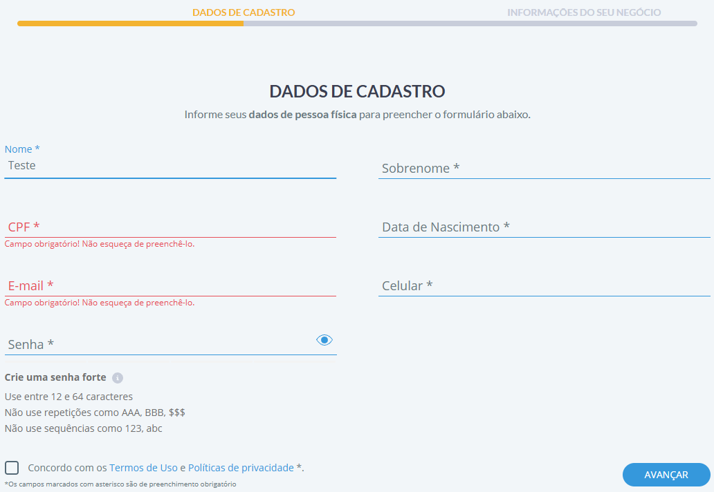 Na página de “Dados de Cadastro” você deverá preencher todos os dados solicitados e, logo após, clique em “AVANÇAR”.