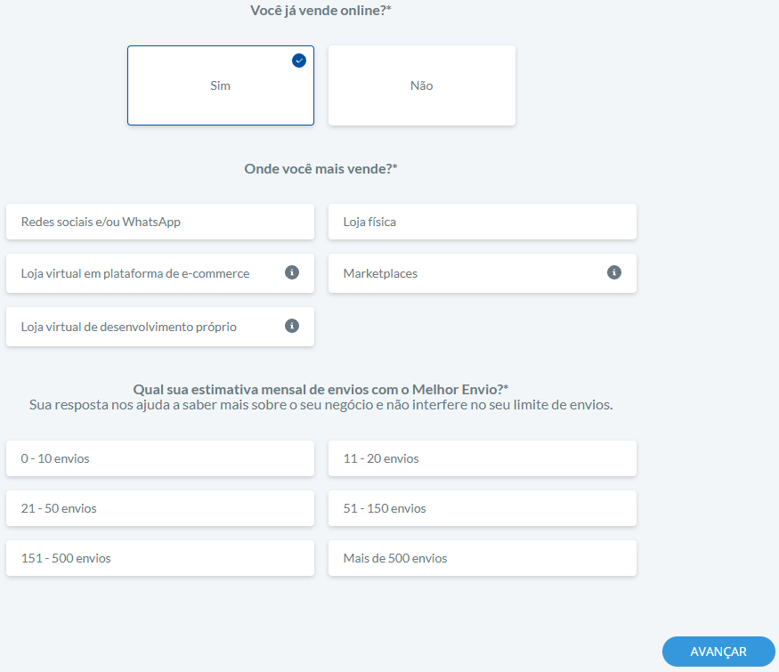 Depois de informações de endereço, a próxima tela será sobre outras informações do seu negócio. Preencha todos os campos e clique em “AVANÇAR”.