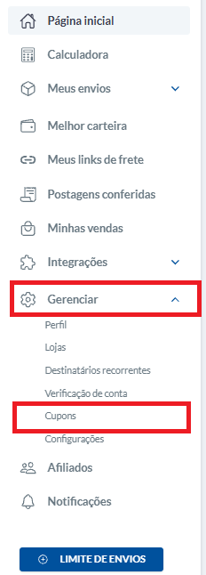 Acesse a sua conta do Melhor Envio e, no menu lateral, clique na opção “GERENCIAR CUPONS” e em “CUPONS”.