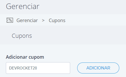 Na aba de cupons, insira o cupom “DEVROCKET20” e clique em “ADICIONAR”.