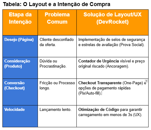 Para capturar essa intenção, não basta ter o melhor preço; o seu e-commerce precisa ser um ambiente de zero atrito, que guie o cliente para a conversão de forma rápida e segura. É aqui que o Layout e a Experiência do Usuário (UX), pilares do desenvolvimento da DevRocket, se tornam os maiores aceleradores de vendas.