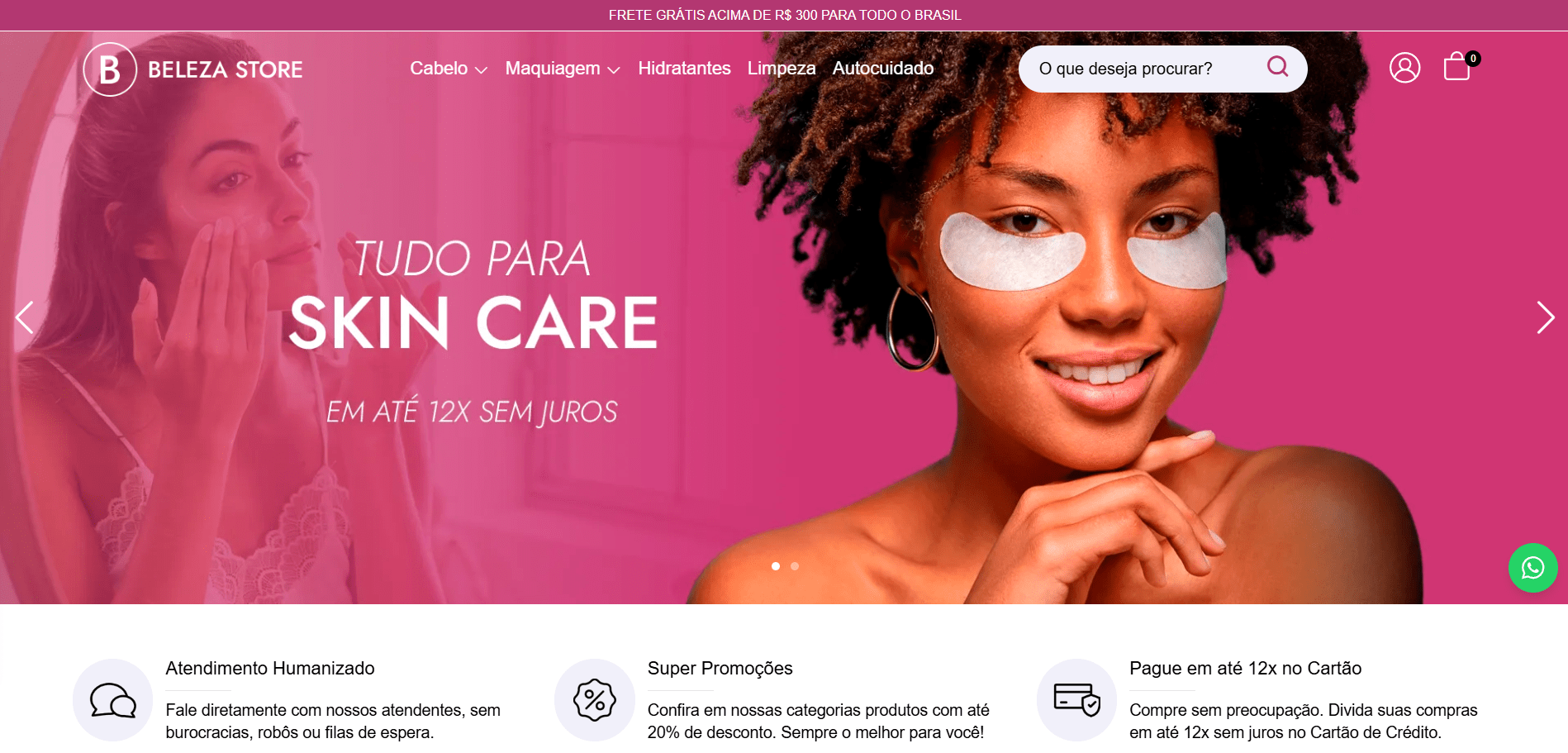Elegante, o tema Beleza - Store possui o banner juntamente com o cabeçalho (podendo ter a apresentação abaixo), possui recursos como alerta LGPD, tarja em carrossel, filtro personalizado na home, selo nos produtos personalizados, escolha na apresentação do preço (somente PIX ou com parcelamento), banners entre seções, WhatsApp flutuante, depoimentos de clientes, notícias na home, Feed do Instagram manual e muito mais!