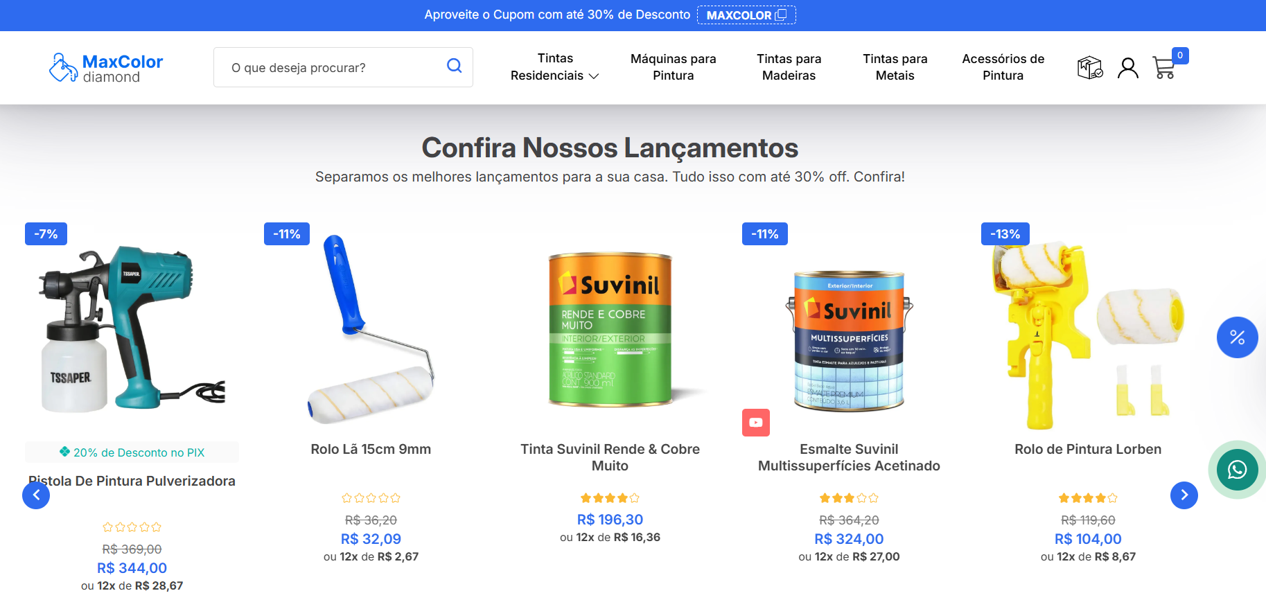 Cada detalhe – do cupom na home ao quickview do YouTube, dos banners estratégicos ao WhatsApp integrado – foi pensado para encantar clientes e aumentar vendas.